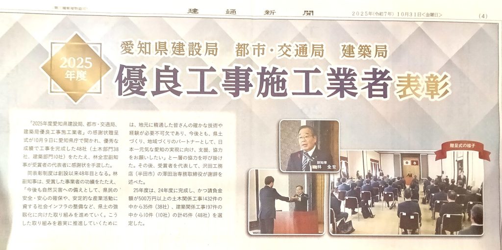 先日の優良工事感謝状贈呈式の様子と工事が建通新聞に掲載されました!!!♪